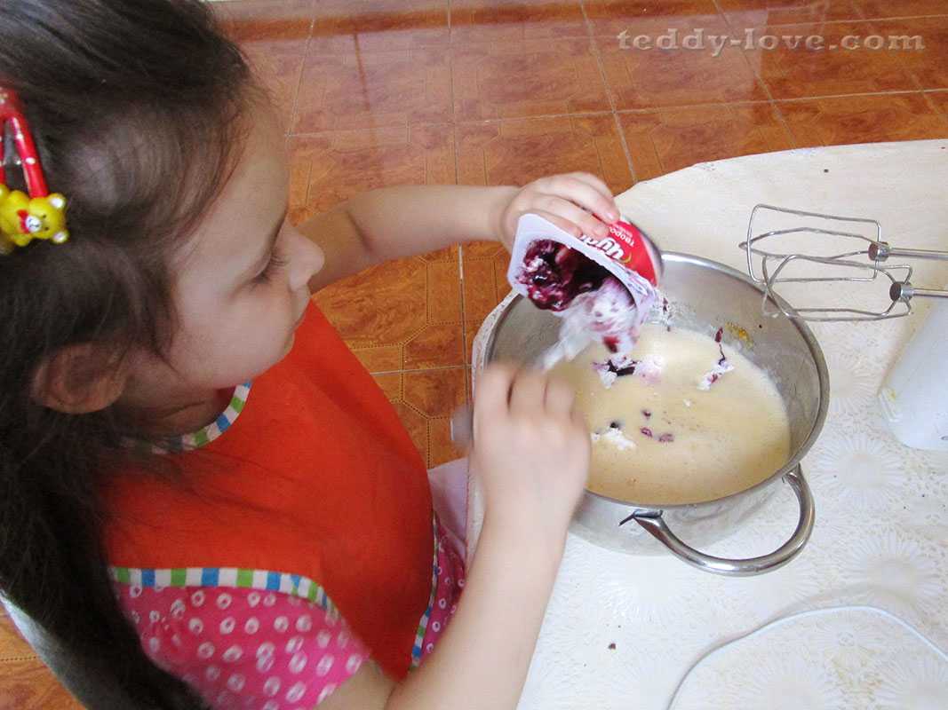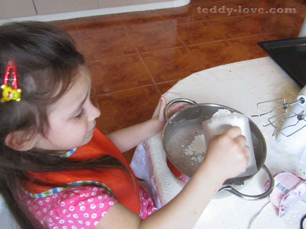 5. Добавьте муку. Разрыхлитель я обычно добавляю в саму муку, еще лучше его с ней перемешать. Лучше сыпать муку частями, но моя дочка всегда сыпет все сразу, хозяюшка)))