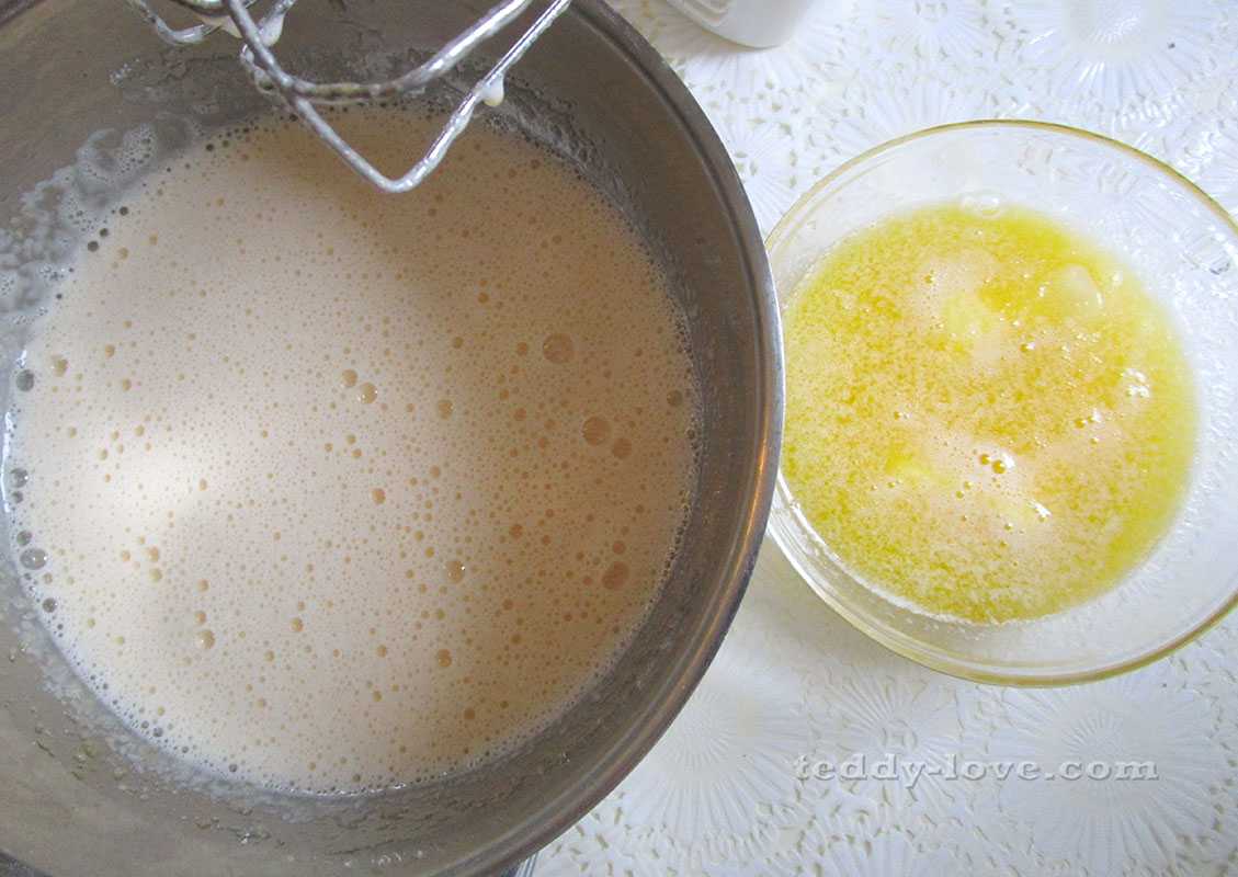 - Сливочное масло растопите до жидкой консистенции и влейте в тесто.