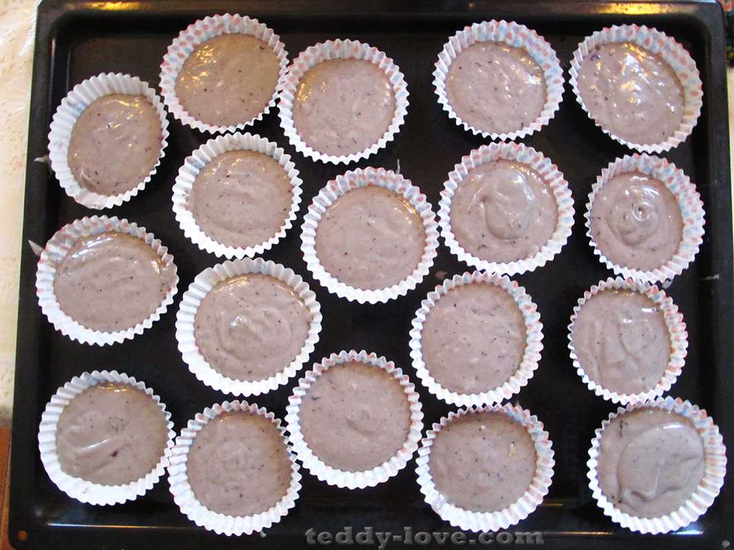 8. Отправляем черничные кексы в духовку (горячую) и печем при 160 градусах до готовности. Примерно 40 минут — час. (Готовность можно проверить проткнув кексик спичкой, она должна быть сухая) Достаем из духовки. Из формочек вынимать только остывшими, иначе на бумаге останутся края кекса.