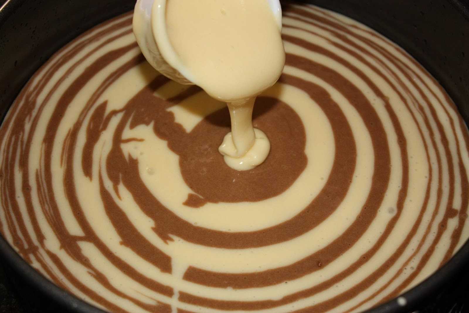 Приступаем к самому интересному и важному этапу: будем делать “зебру”. Соблюдайте очередность добавления теста: шоколадное тесто, потом светлое тесто, снова шоколадное тесто, потом светлое и т.д