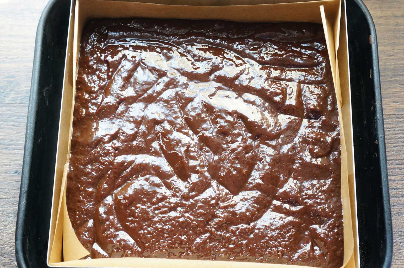 - Берем форму, аккуратно застилаем пергаментом и выливаем содержимое.