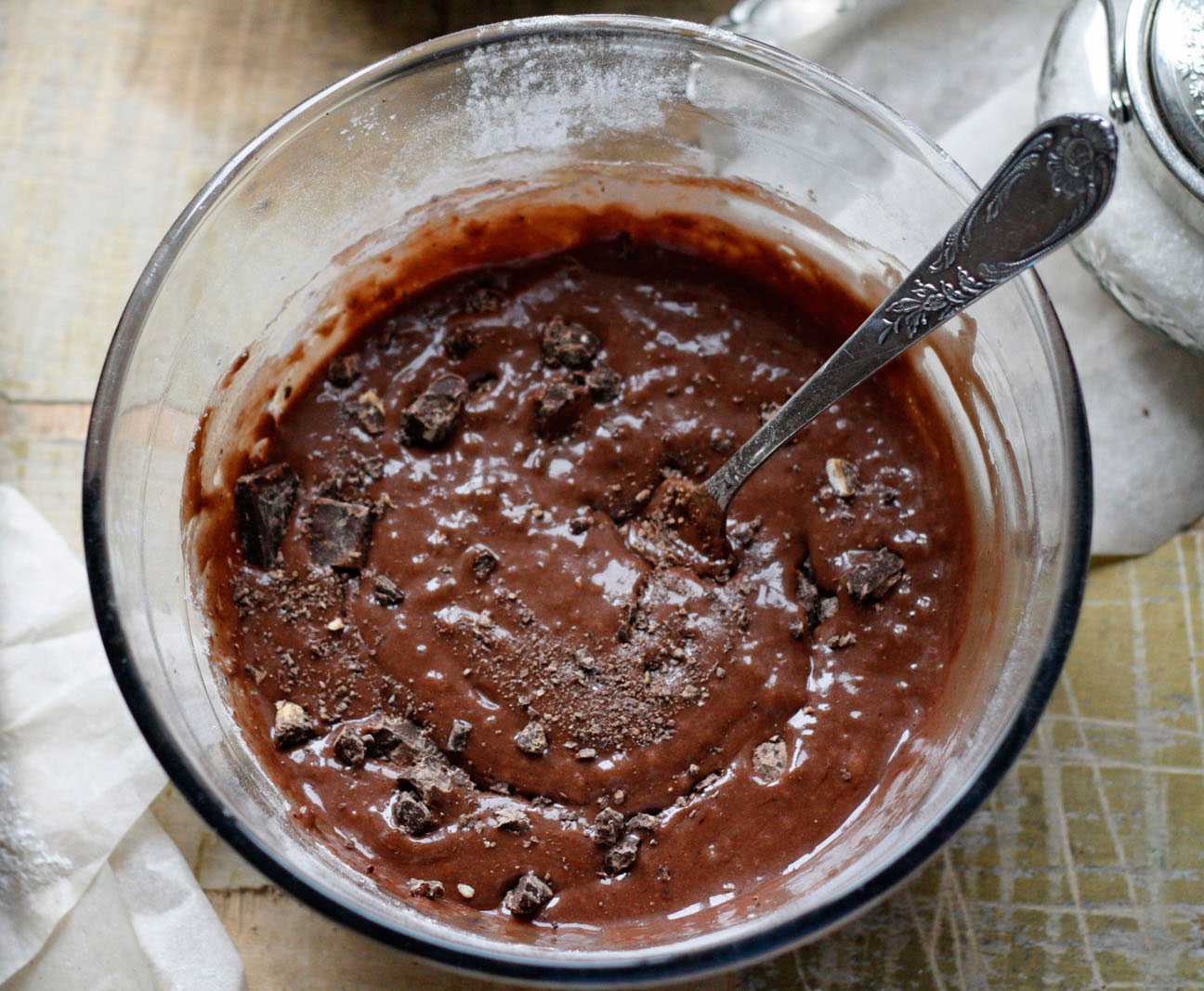 - Влить шоколад в тесто, тщательно перемешать, до однородности;
