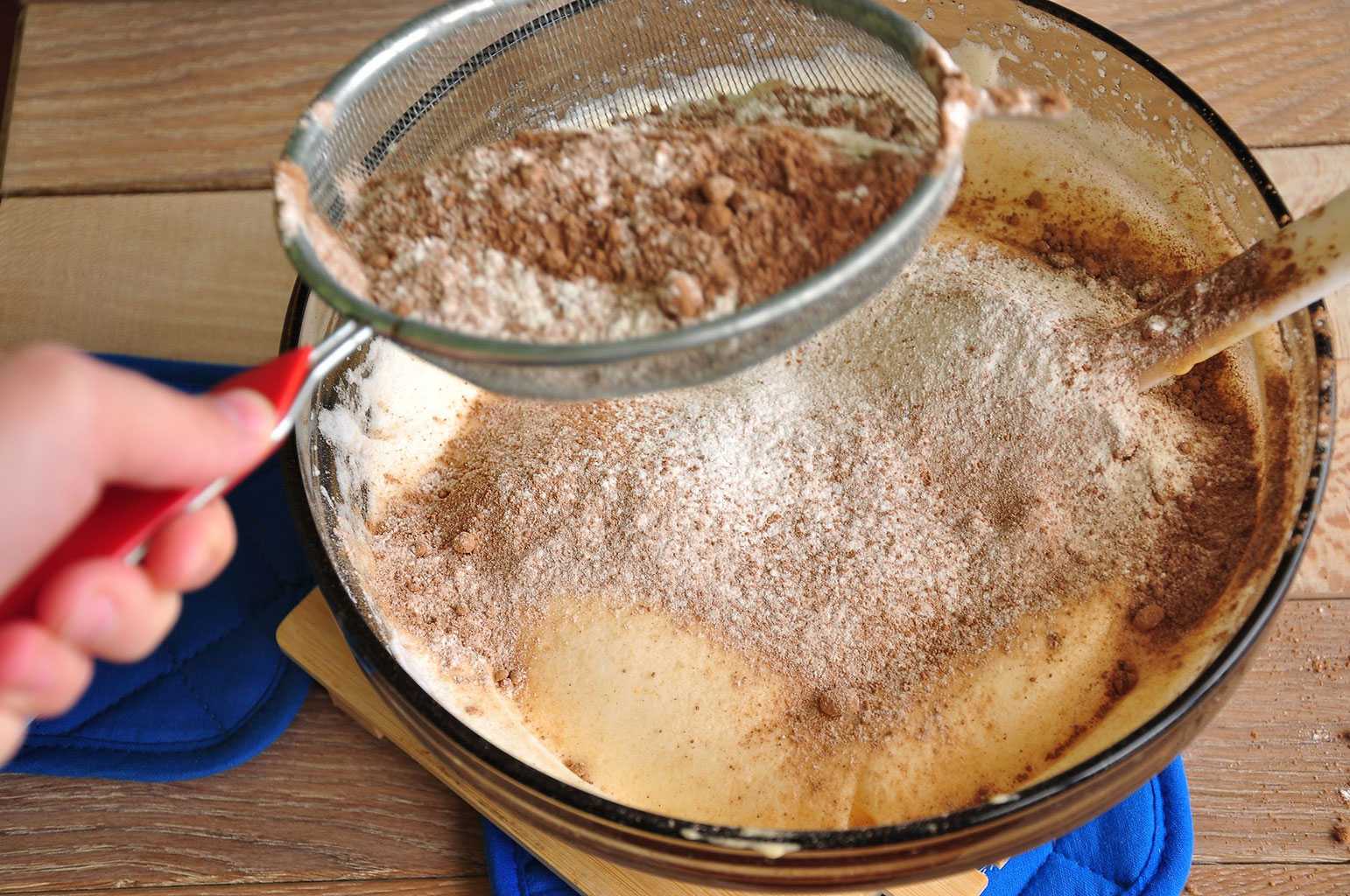 Затем добавим муку и какао. Хорошо перемешиваем.