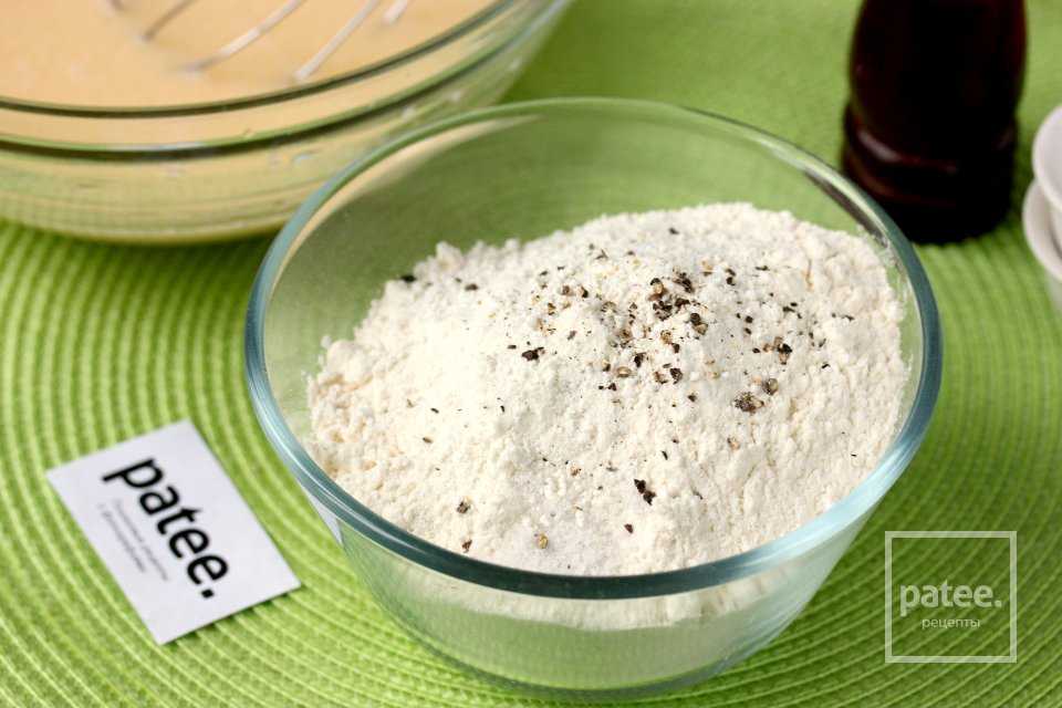 Тажке в муку с солью и разрыхлителем всыпаем чёрный молотый перец.