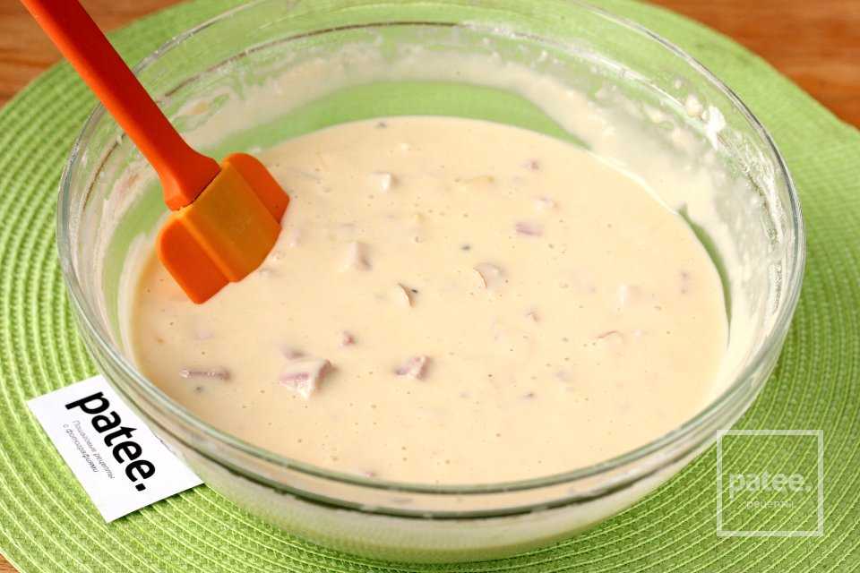 Вмешиваем сыр и ветчину в тесто. Тесто получается не густым, более жидким, чем обычное кексовое тесто.