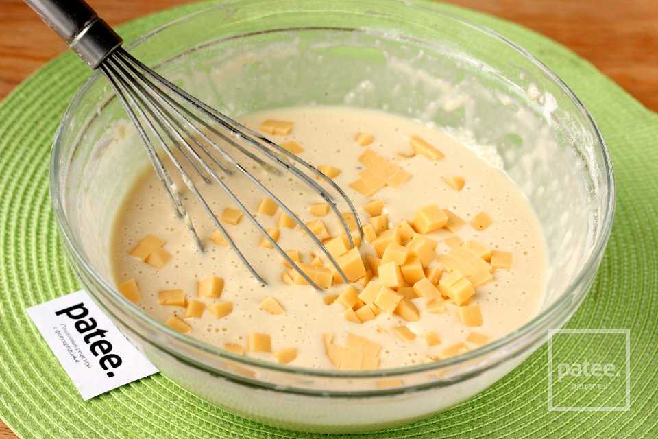 Просеиваем муку с солью, перцем и разрыхлителем один или, что ещё лучше, два раза. Всыпаем смесь сухих ингредиентов в яично-молочную смесь и замешиваем венчиком тесто. Твёрдый сыр нарезаем маленькими кубиками и добавляем в тесто.