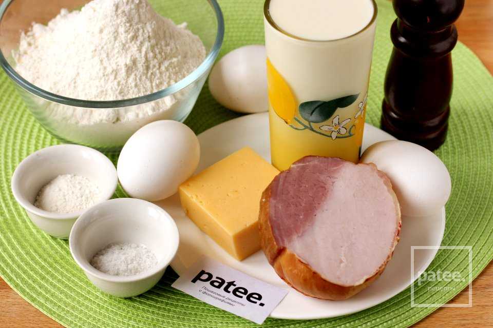 Для приготовления кексов с сыром и ветчиной нам понадобятся следующие ингредиенты: пшеничная мука, твёрдый сыр, ветчина, куриные яйца, молоко, соль, разрыхлитель, масло подсолнечное рафинированное, чёрный молотый перец.