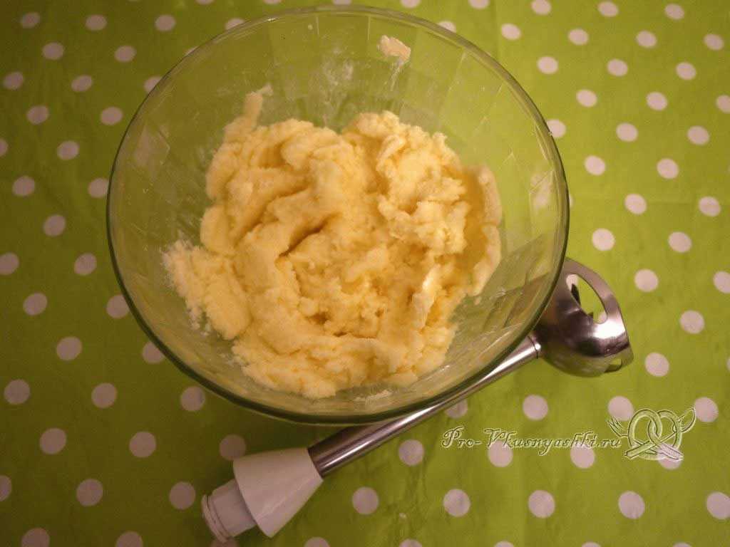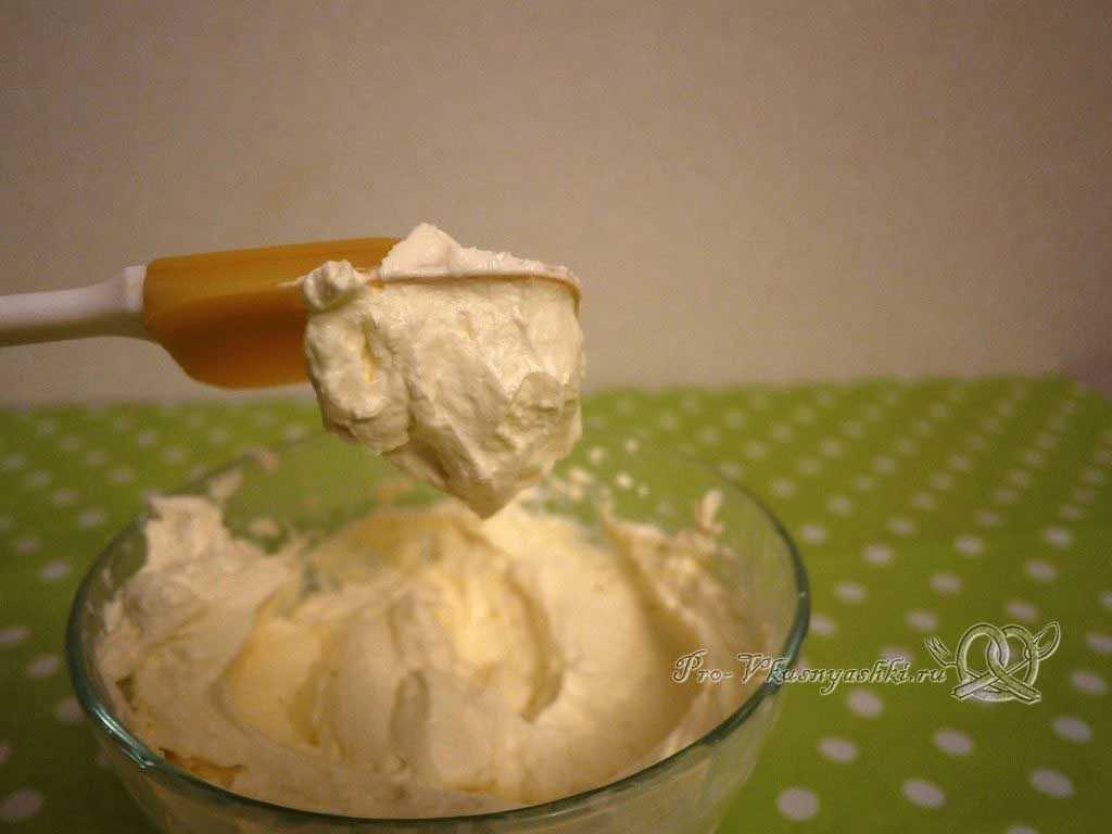 Готовность второй составляющей нашего десерта можно определить по ее консистенции и цвету. Крем должен быть пышным, густым и матовым, нежного светло-желтого цвета.
