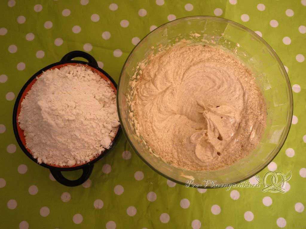 К сладкой яично-масляной смеси добавляем просеянную пшеничную муку (2,5 ст) и разрыхлитель (2 ч.л).