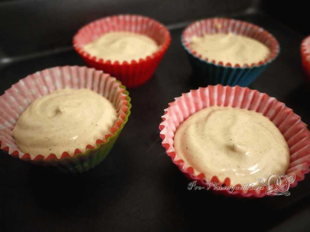 Раскладываем или даже разливаем наше тесто по формам, заполняя их не более, чем на половину. Я использую специальные одноразовые бумажные корзиночки для капкейков, так удобнее подавать десерт на стол и можно смело есть эту сладость, не боясь испачкать руки.