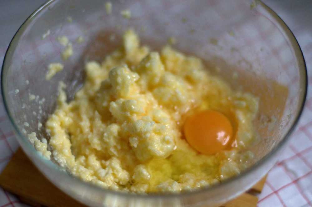 Кладём в тесто сметану, затем яйцо. Аккуратно перемешиваем