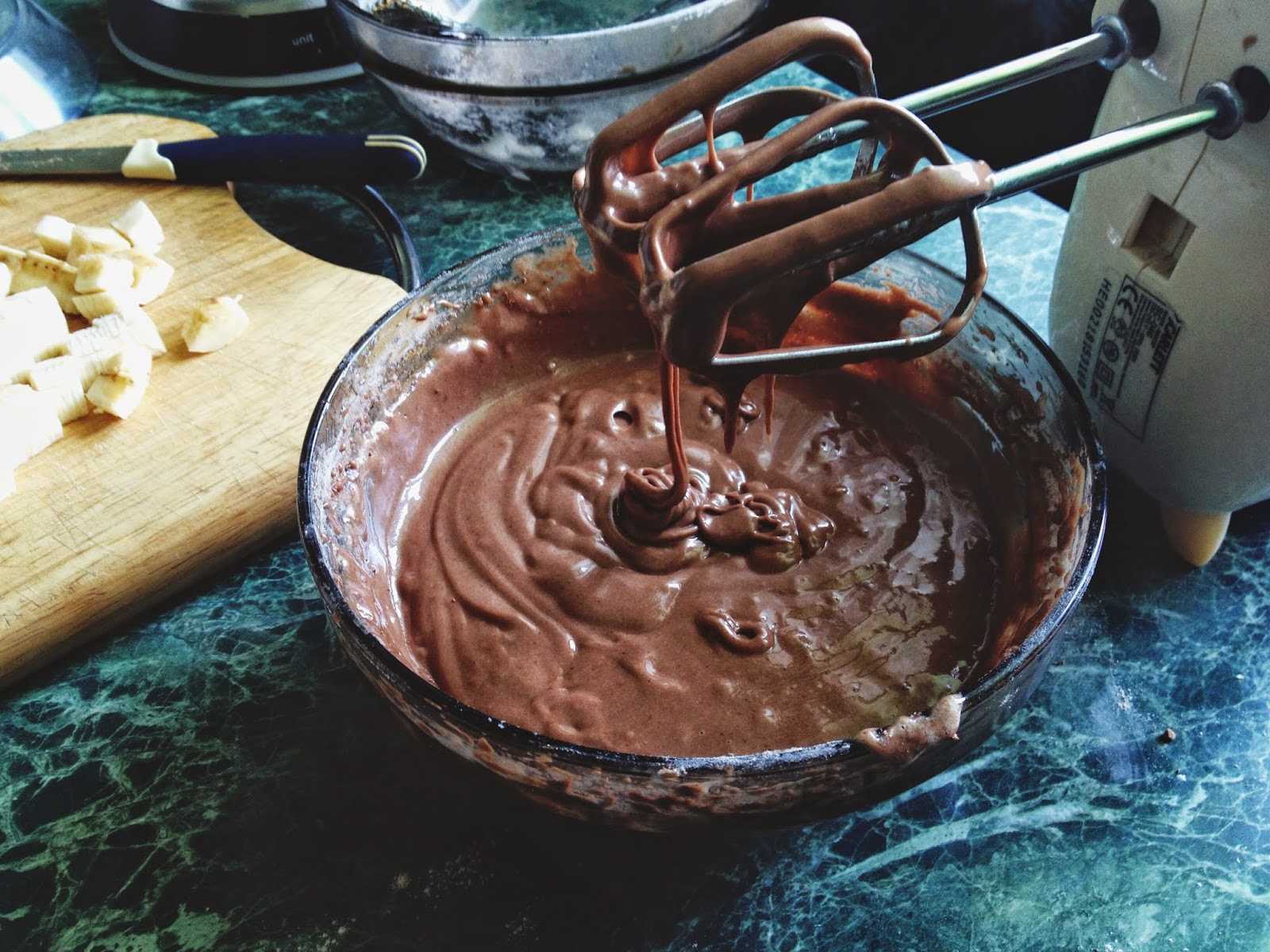 Обязательное условие для вкусного и пористого шоколадно-бананового кекса — качественное взбивание. Можно работать ручным венчиком, но продолжительно, с усердием. Перемешать на скорую руку компоненты, как для выпекания блинов или панкейков здесь не выйдет. Имея миксер, машину для замеса, доверьтесь мощным агрегатам — лучший результат при минимуме времени и трудозатрат обеспечен.