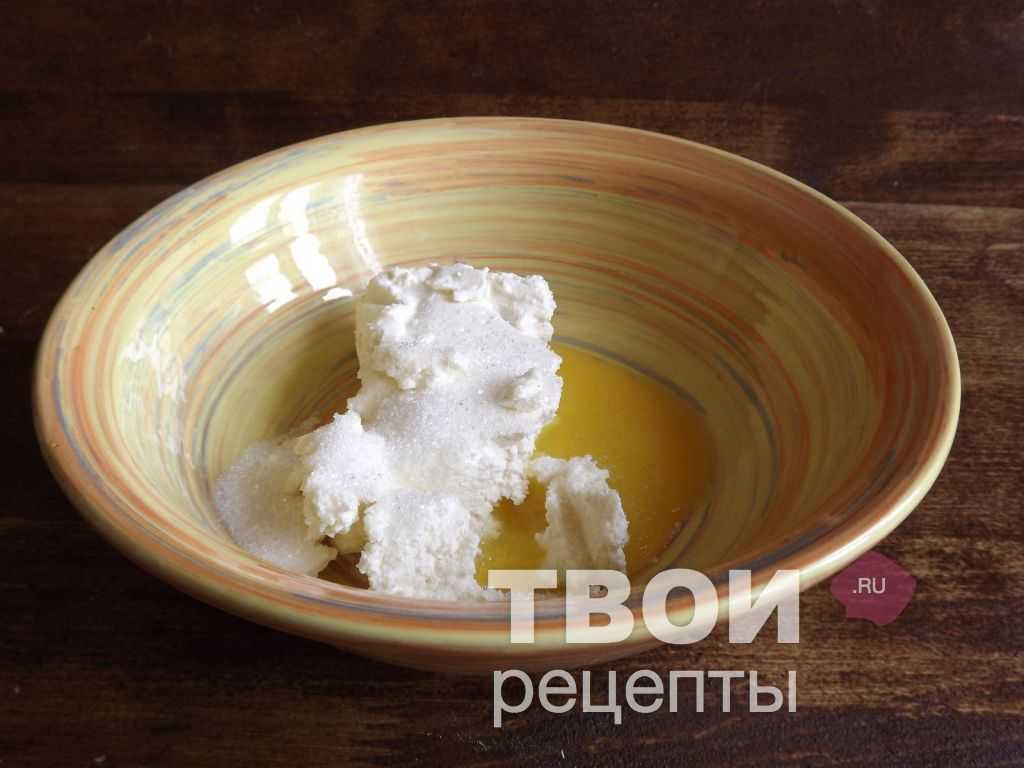 Тем временем займемся начинкой. Для чего смешать вместе творог, оставшийся желток и 3 ст.л. сахара.