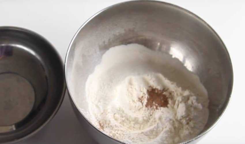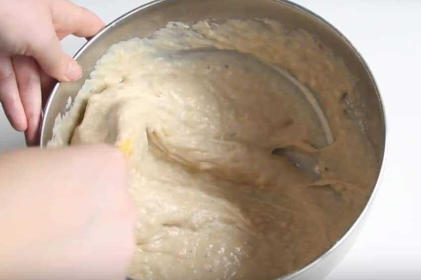 Сначала смешиваются все «сухие» ингредиенты: соль, мука, сахар и дрожжи. После этого замесите «сырые»: сметана ,кефир, яйца. Все компоненты смешиваются и оставляются отдыхать на час.