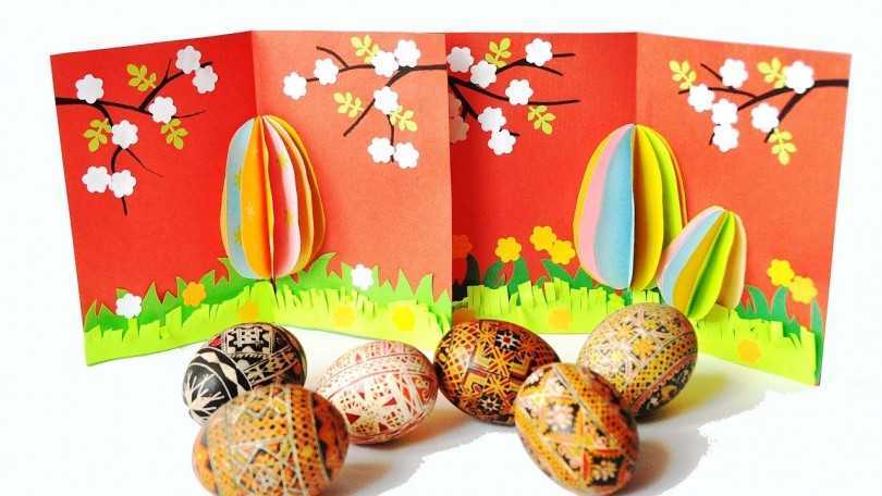 Украшают цветными бумажными яйцами, цыплятами, цветочками, веточками, бантами поздравительные открытки и подарочную упаковку.