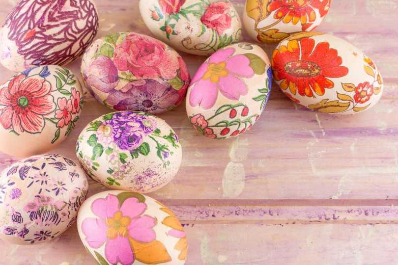 Сварите яйца, остудите их и высушите. Приготовьте трехслойные разноцветные салфетки, кисточку и яичный белок в качестве клея. Можно приступать к декорированию: