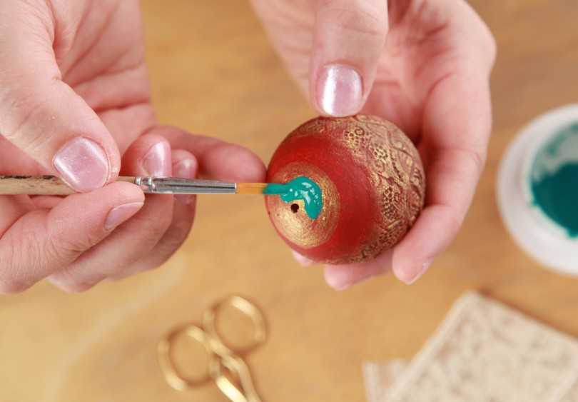 - Закрасьте контуры краской нужного цвета. Сначала заполните крупные элементы узора. После их высыхания поверх наложите мелкие.