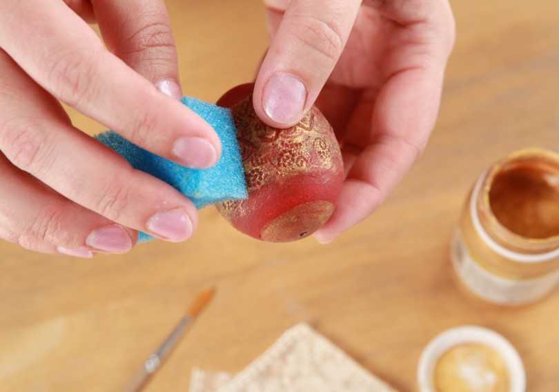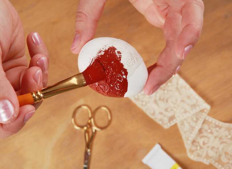 Используя губку, обмажьте скорлупу подходящей акриловой краской, чтобы сделать фон для будущего рисунка (в данном примере это будет рябиновая гроздь). Оставьте заготовку сушиться. При необходимости нанесите второй слой краски.