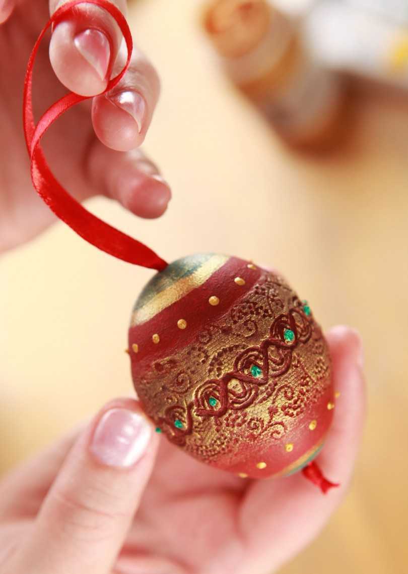 После этого таким же образом вам надо будет сделать вторую половинку праздничного изделия, а затем при помощи клея скрепить их вместе. Второй способ более сложный, но зато и результат получится более интересный. В этом случае вам сначала надо будет сделать гипсовую заготовку, приготовить объемный декор из бумаги, а затем зафиксировать его при помощи клея.