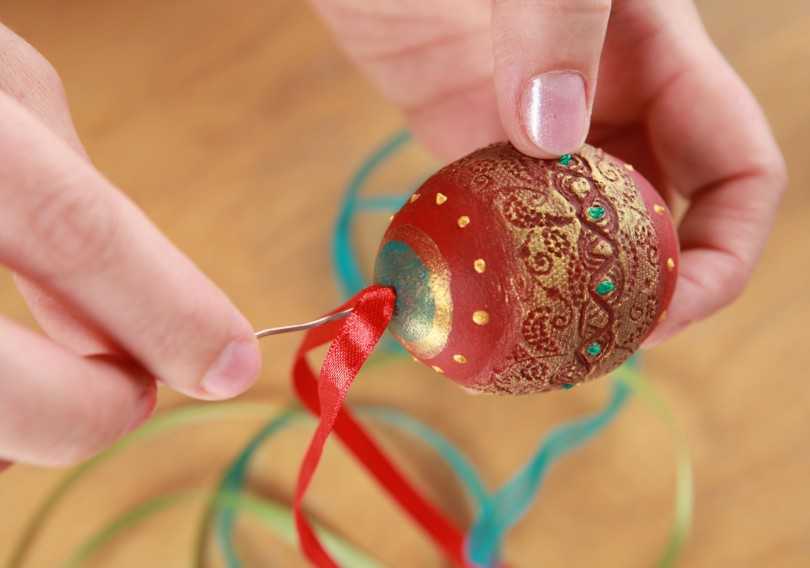 Если у вас пенопластовая заготовка или яичная скорлупа, воткните сверху зубочистку, а затем приклейте к ней кончик нити.