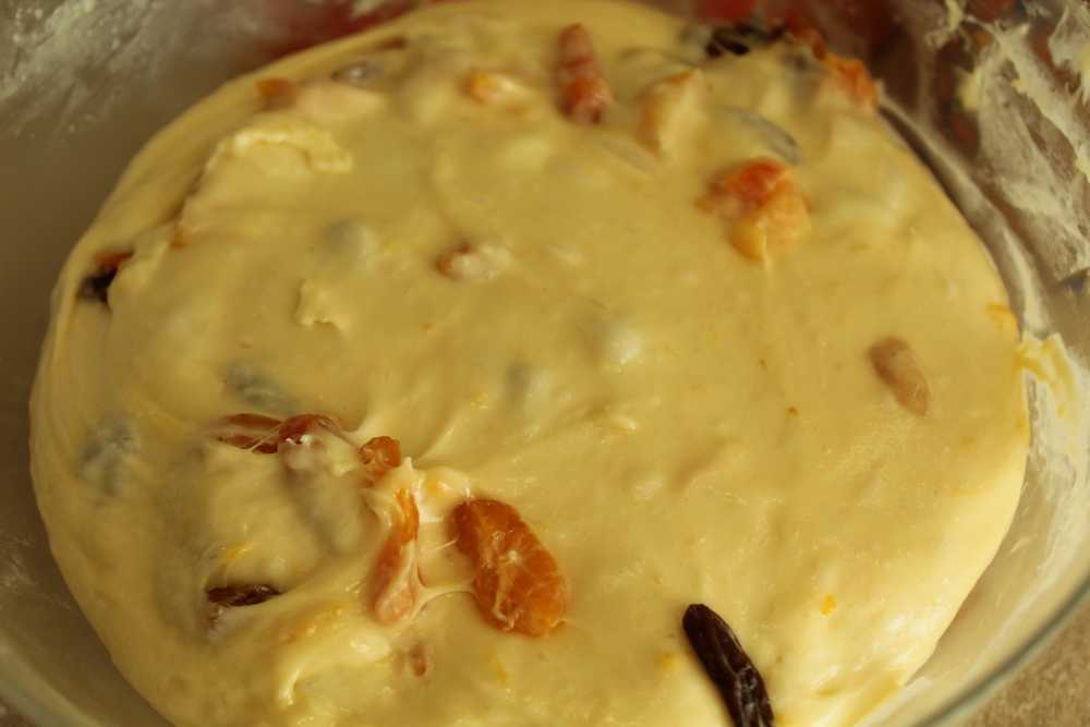 - Постепенно добавляйте мягкое масло по одной ложке и перемешивайте до получения однородной, блестящей и эластичной массы. Смешайте вместе засахаренные апельсины и изюм и добавить в тесто. Разрешите тесту отдохнуть в течение одного часа при 27 ° С.