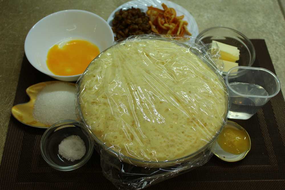 - Снова дают массе подойти, высыпают оставшийся изюм и вымешивают.