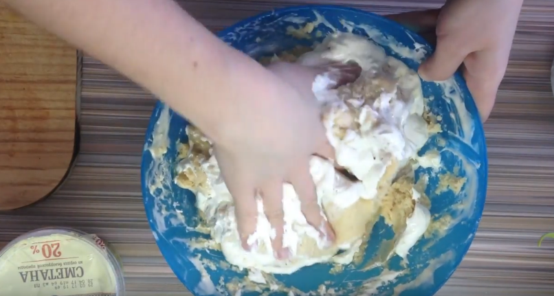 Когда вся мука будет вмешана и масса станет похожа на тесто, добавляем к ней размягченное масло и сметану и продолжаем замешивать тесто руками.