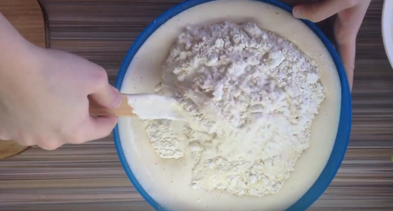 - Небольшими порциями добавляйте муку, тщательно замешивая тесто.