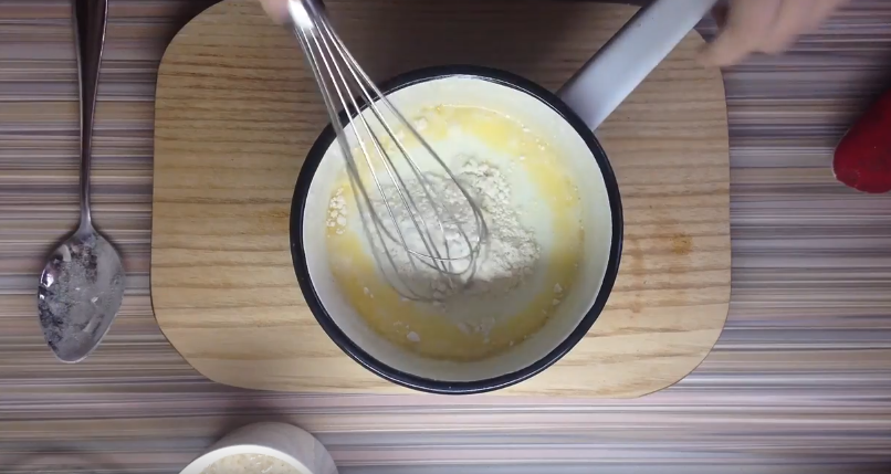 1. Отливаем из стакана 50 мл молока для опары, а оставшееся ставим на огонь и доводим до кипения. Когда молоко закипит, снимаем его с огня, добавляем к нему 2 столовые ложки просеянного теста и замешиваем венчиком, стараясь, чтобы не было комочков и получилась однородная смесь по густоте напоминающая сметану.