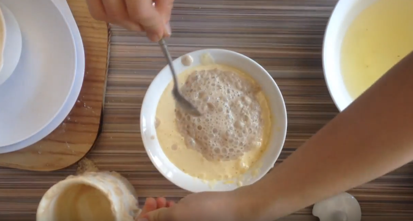 4. Активировавшиеся дрожжи соединяем и смешиваем с яичной смесью.