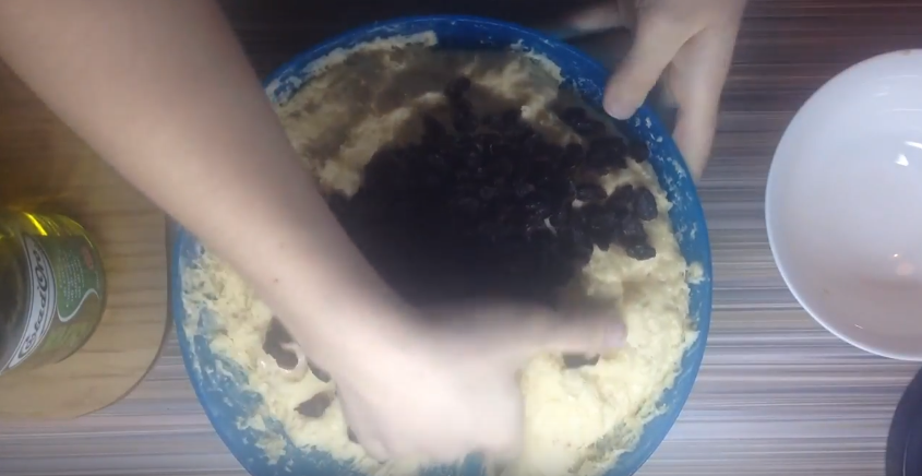 7. Когда тесто подойдет, высыпаем в него заранее замоченный в кипятке и высушенный изюм и еще раз замешиваем тесто уже с начинкой.