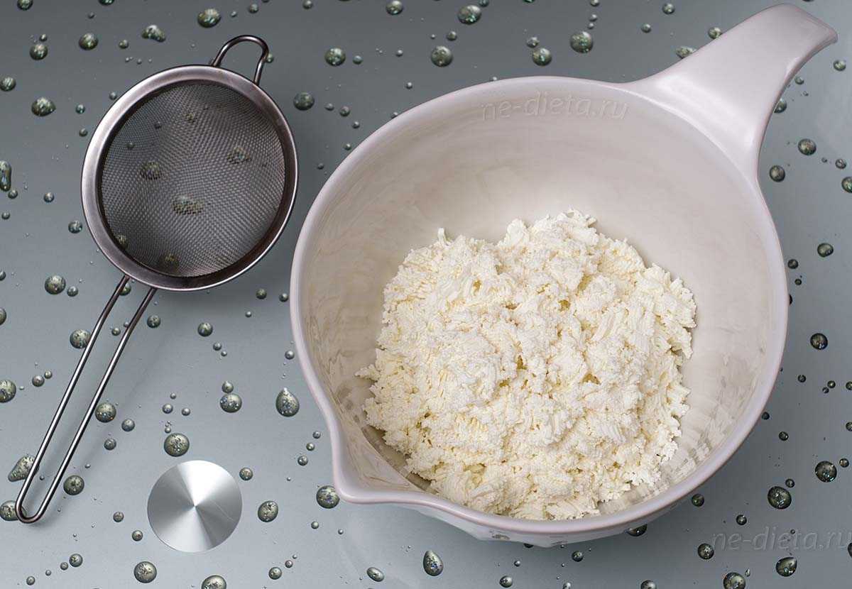- У вас сырой творог? Поместите в марлю и отожмите руками жидкость. Протрите сухой творог через сито.