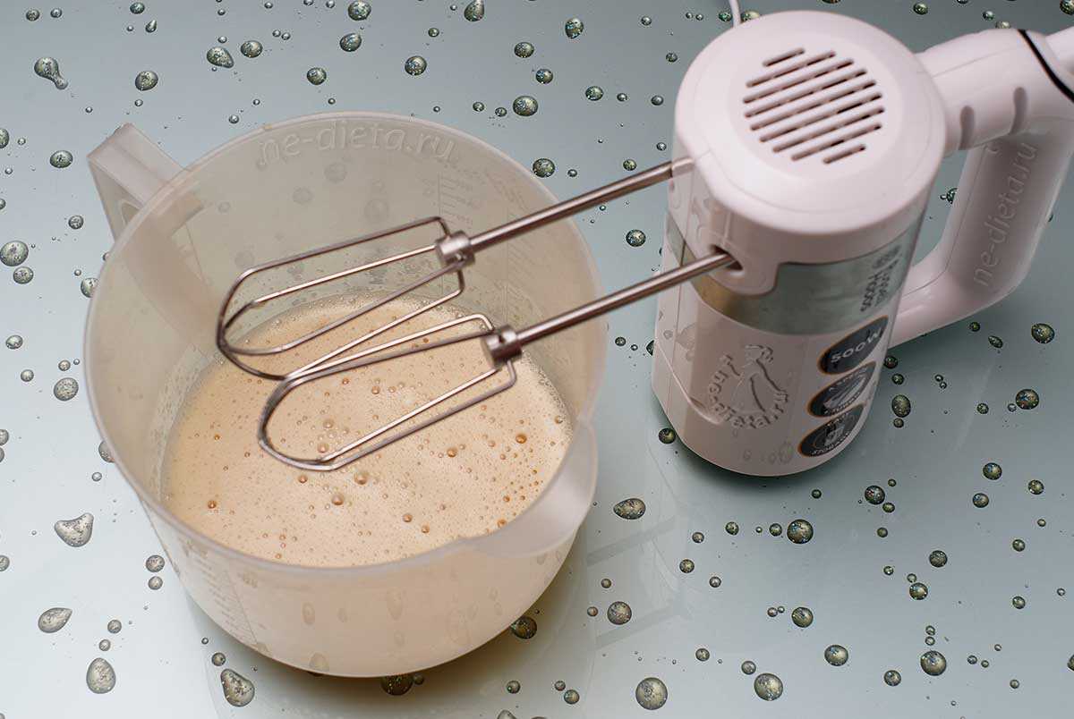 - Белки взбейте с сахаром до густой пены. Аккуратно вмешайте в творожную заготовку.