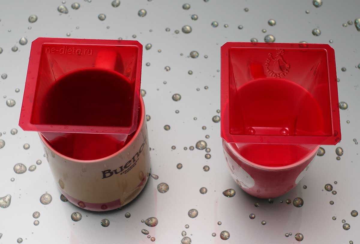 10. Теперь творожную смесь для пасхи надо распределить в специальные формы с дырочками, через которые будет вытекать лишняя жидкость. Для этого формы сначала нужно вставить в перевернутом виде в подходящую по размеру посуду для слива таким образом, чтобы они не касались дна. Поскольку у меня были две формочки для пасхи не очень большого размера, то они удачно поместились в две широкие кружки.