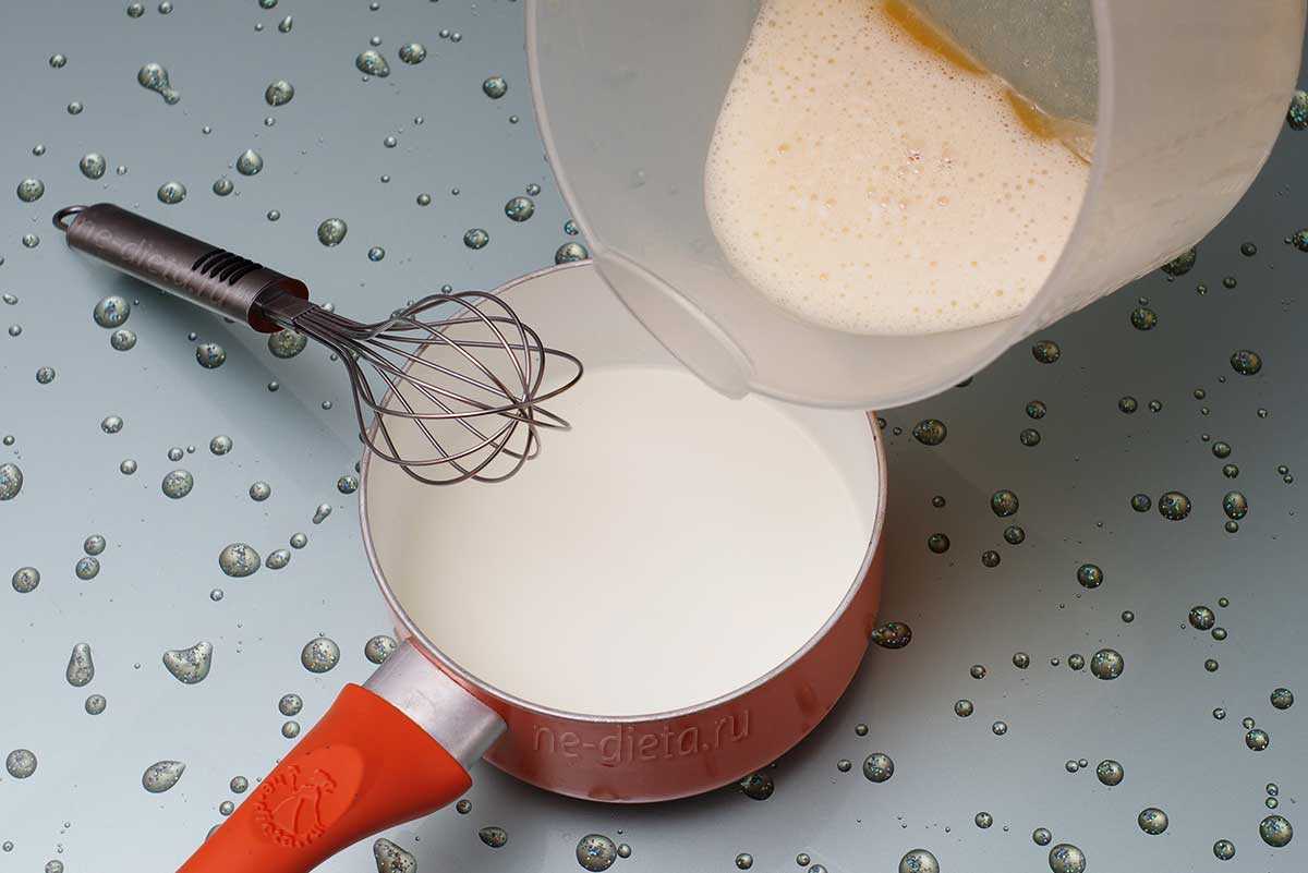 3. В небольшой кастрюле подогреть сливки до горячего, но не кипящего состояния и снять с плиты. Добавить в них ванилин и тонкой струйкой влить яичную смесь, энергично перемешивая при этом венчиком.