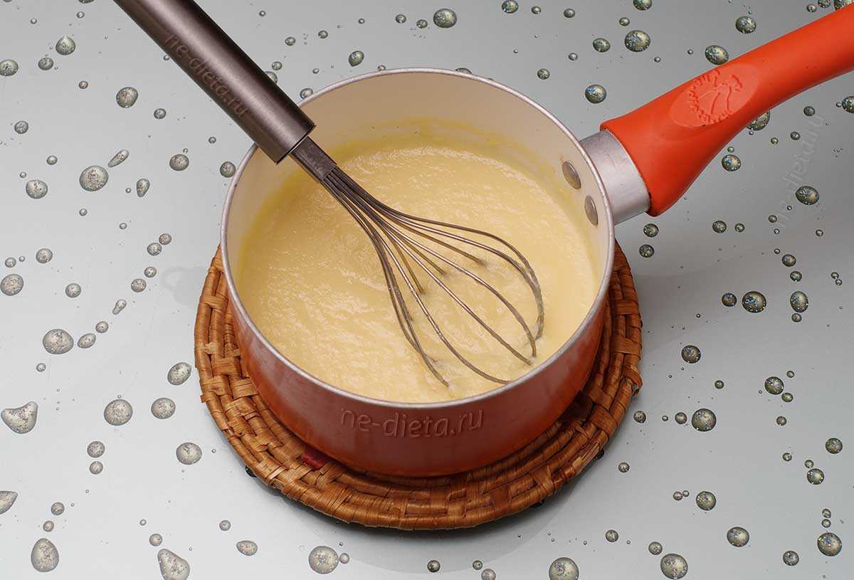 Совет! Несмотря на то, что это не самое приятное занятие, но в процессе приготовления заварного крема очень желательно не отходить далеко от плиты и мешать крем практически непрерывно, иначе он может легко подгореть или же свернуться и превратиться в неоднородную комковатую массу. Подгоревший крем непригоден для дальнейших манипуляций, поскольку придаст блюду неприятный запах и вкус, а свернувшийся заварной крем можно спасти, если протереть его через мелкое сито или хорошо обработать блендером.