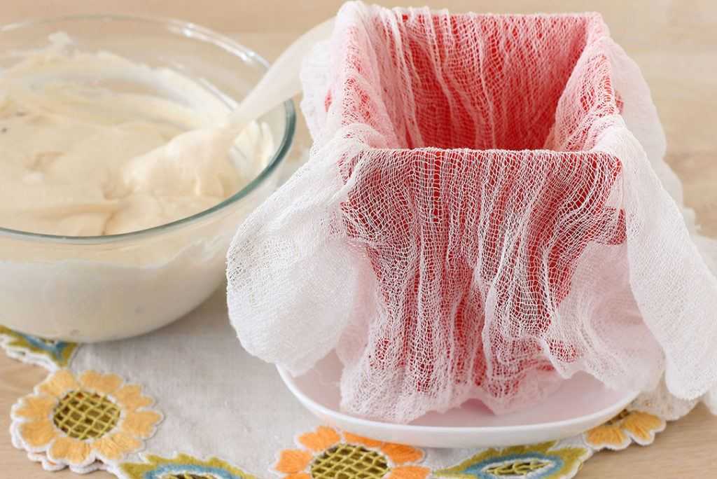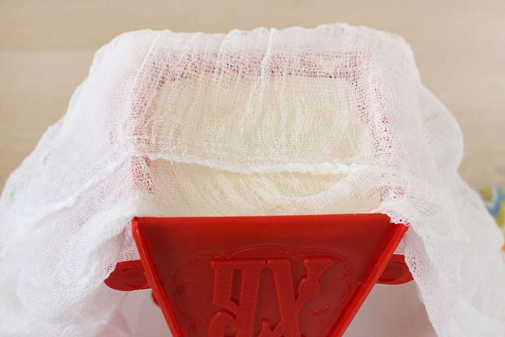 6. Для придания традиционной формы используем пасочницу. Застилаем ее двумя слоями марли так, чтобы края марли свисали.