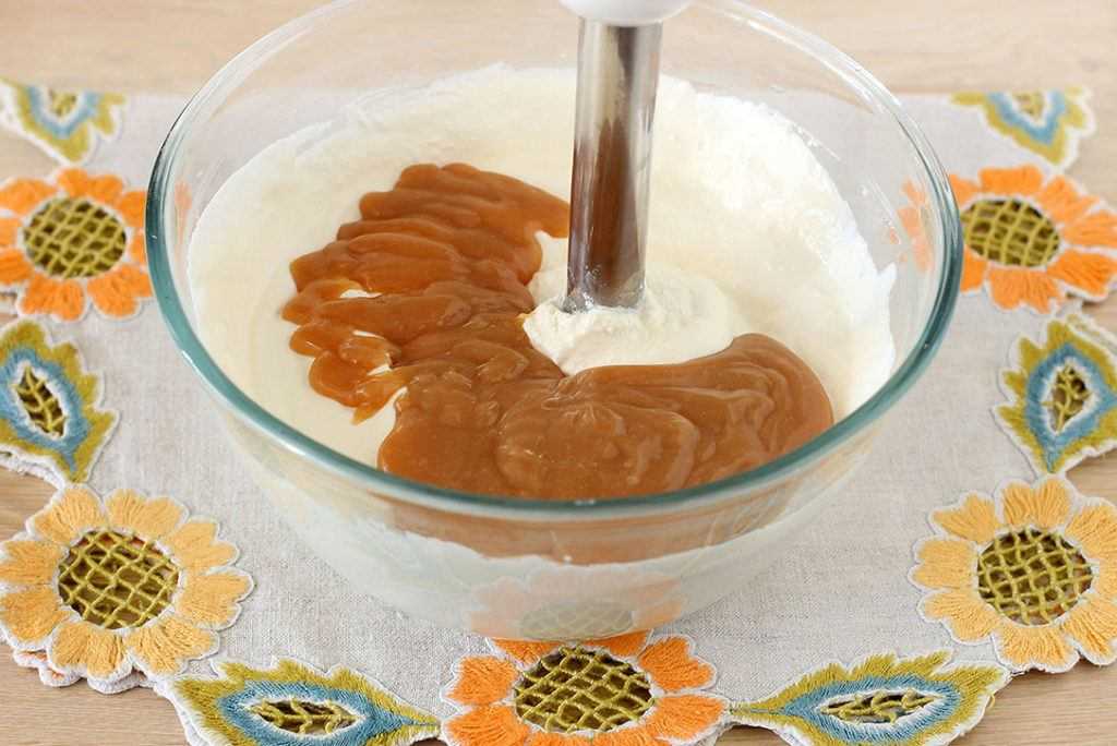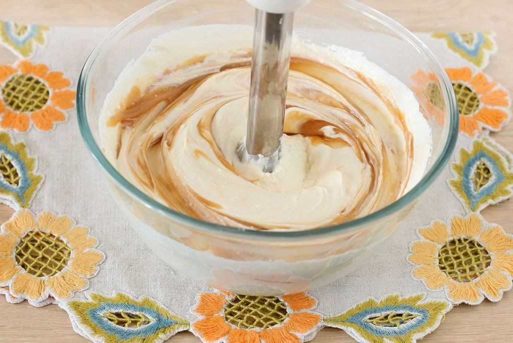 6. Вмешиваем карамель, работая погружным блендером. Теперь нужно попробовать массу на сладость и если она вас не устраивает – добавить столько сахара, сколько вы посчитаете нужным или вовсе обойтись без него, так как сливочная карамель может быть сама по себе очень сладкой.