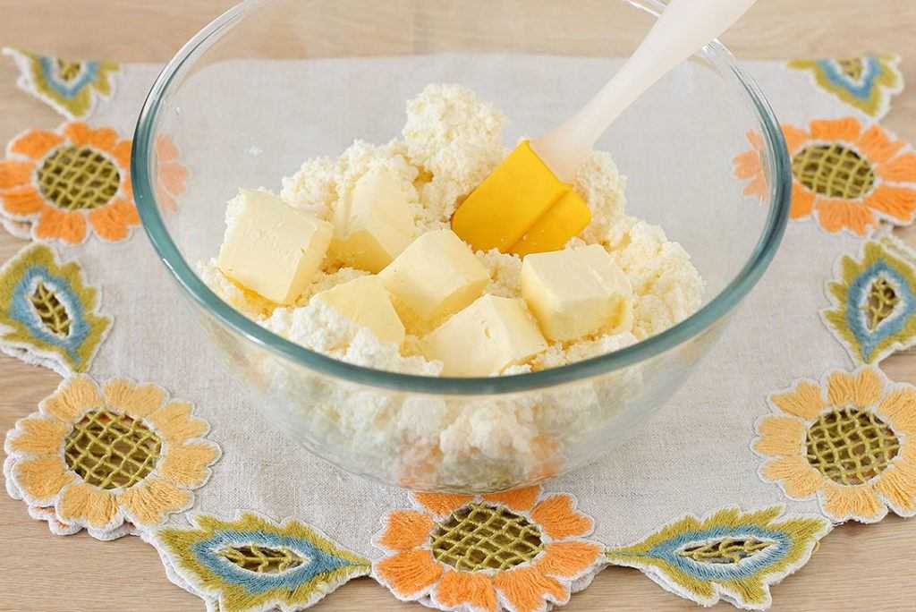 Далее добавьте к творогу размягченное сливочное масло и перемешайте.