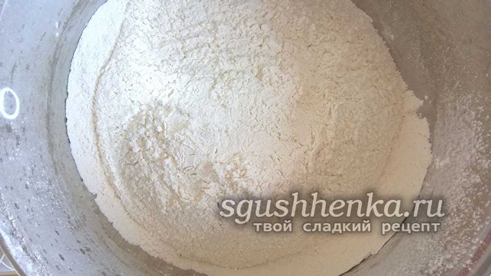 Теперь добавляем половину нормы муки, это 3.5 стакана, мука обязательно должна быть просеянной. Можно просеивать не один раз.