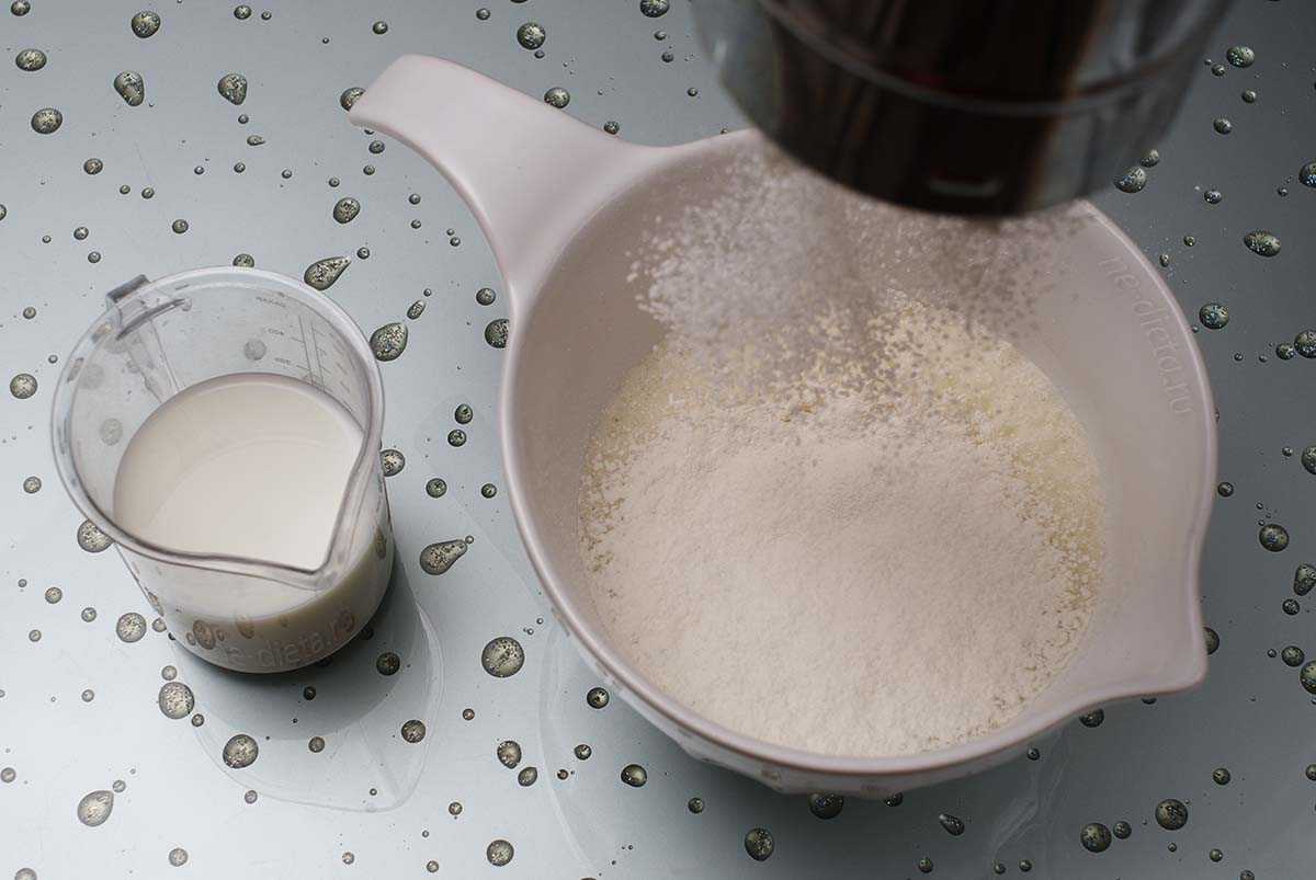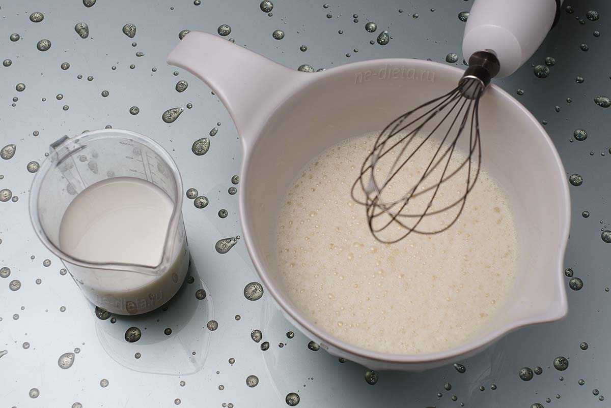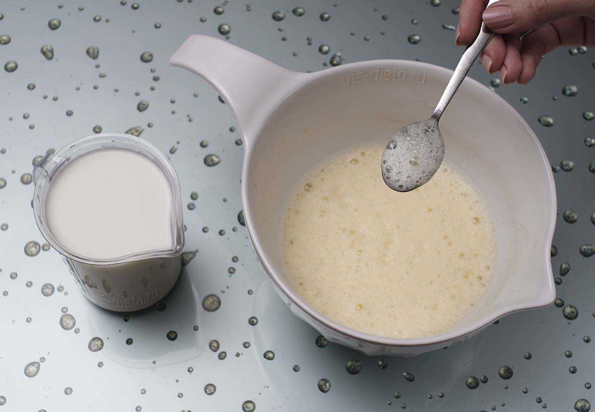 Наливаем молоко. Количество молока можно регулировать, чтобы в итоге получить тесто густое, но текучее