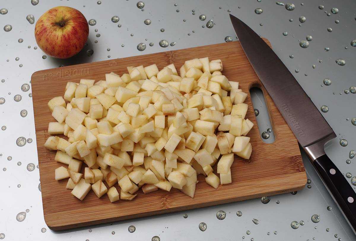 9. Пока пекутся блины, можно заняться приготовлением яблочной начинки для их фарширования. Для этого яблоки очистить от кожуры и семян и порезать мелкими кубиками.