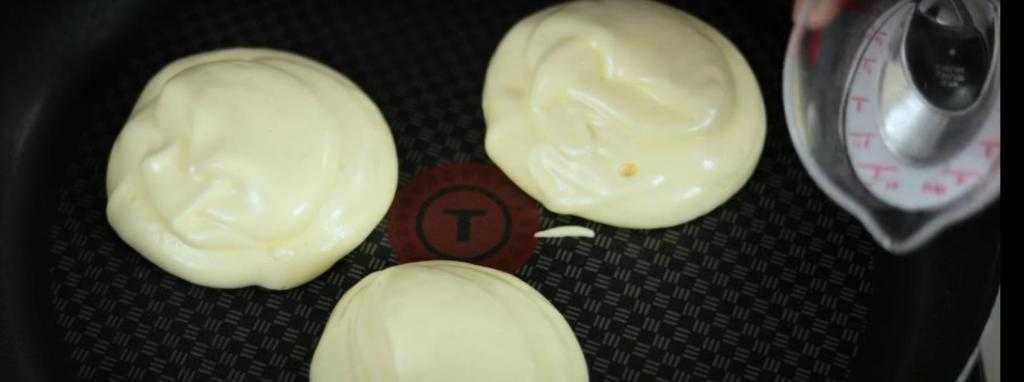 - Сковороду разогрейте и смажьте небольшим количеством растительного масла. Выложите по столовой ложке теста и сформируйте круглые панкейки, тесто не должно растекаться. Затем положите сверху еще по одной ложке теста. Влейте на сковороду пару столовых ложек воды и жарьте панкейки при закрытой крышке 3-5 минут.