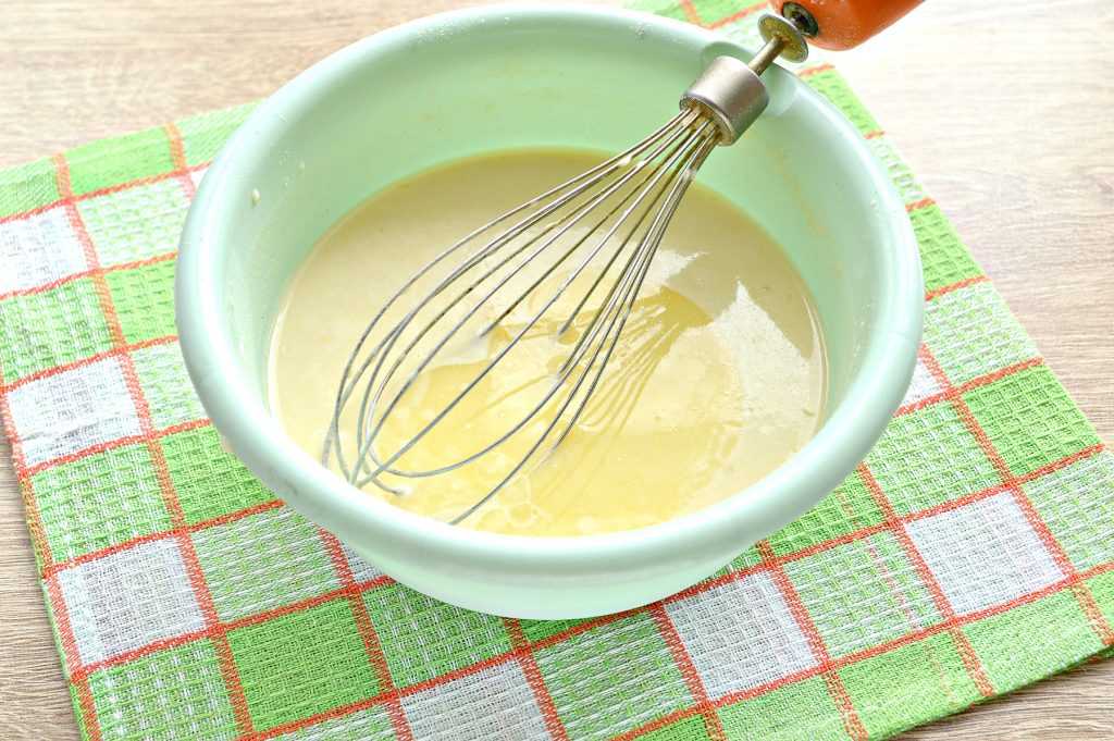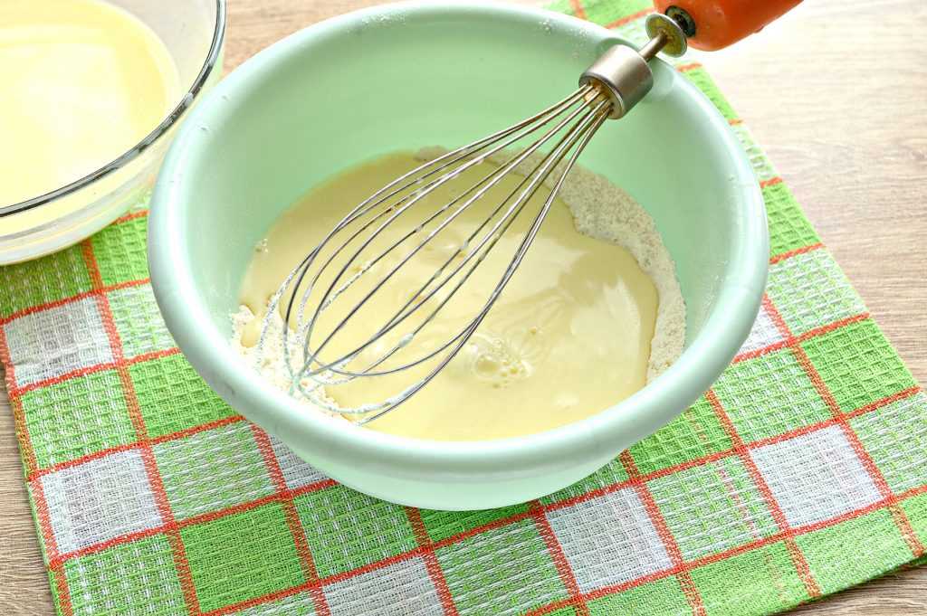 - Аккуратно всыпаем 2-3 раза просеянную муку. Размешиваем так долго, пока не исчезнуть последние комочки.