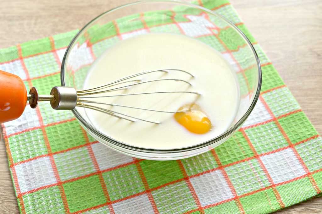 В другую миску вливаем комнатной температуры молоко, добавляем в него поочередно куриные яйца. Ингредиенты взбиваем примерно 2-3 минутки.