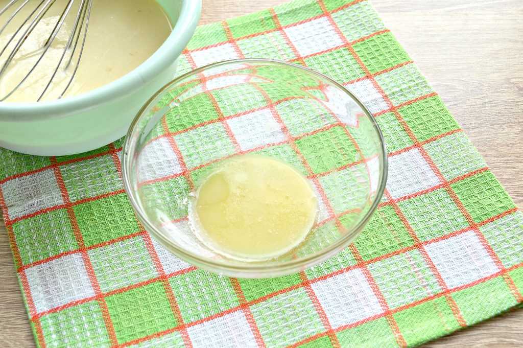 В него нужно влить растопленное сливочное масло. Если вы не растопили масло заранее, то воспользуйтесь «услугами» микроволновки.
