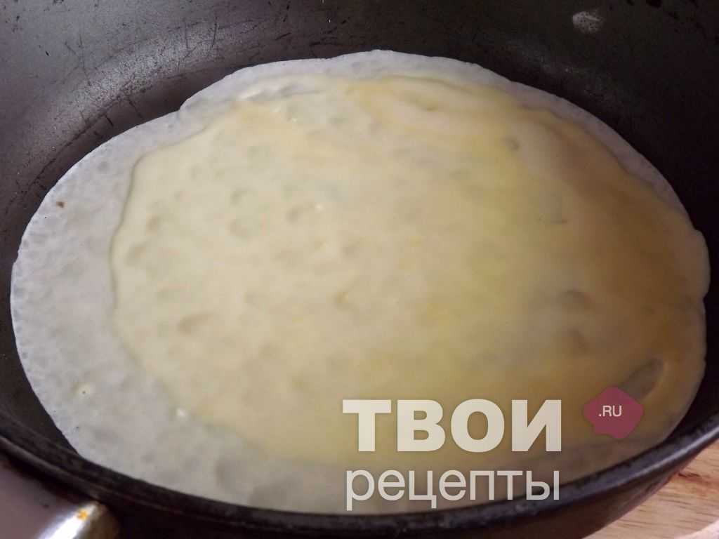 И поварачивая сковородку, распределяем тесто по всей поверхности и жарим, пока не поджарится одна сторона. Затем переворачиваем.