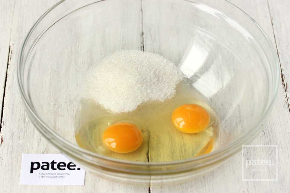 В глубокой миске соединяем куриные яйца и сахар и взбиваем их венчиком до получения однородной смеси.