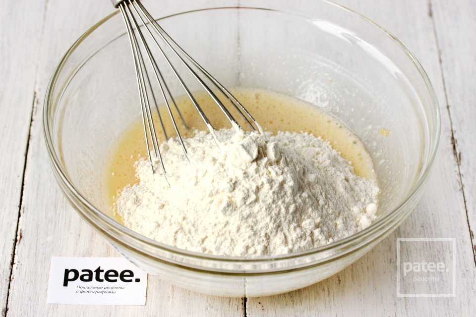 После всыпаем просеянную с разрыхлителем пшеничную муку.