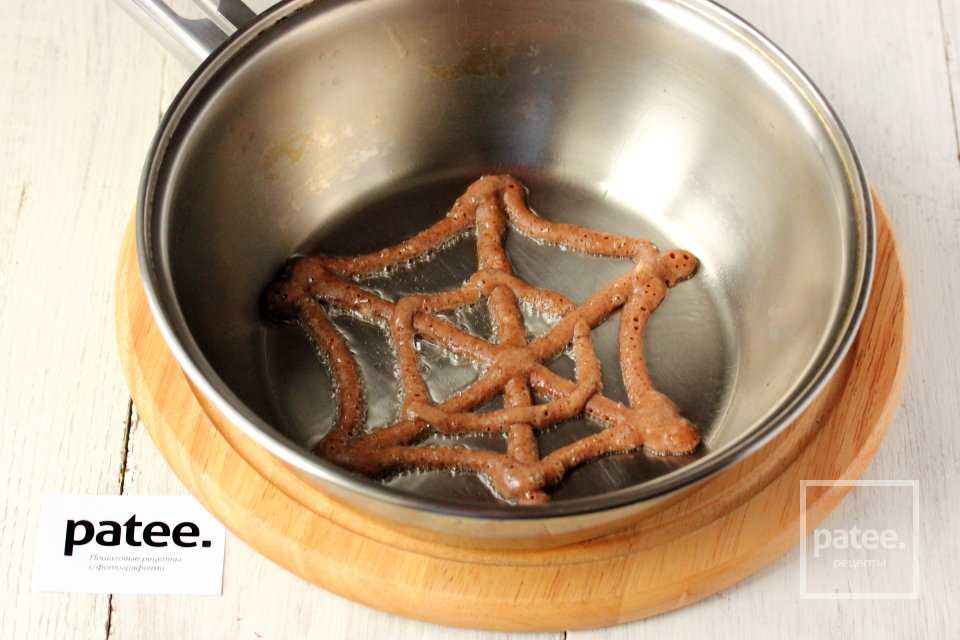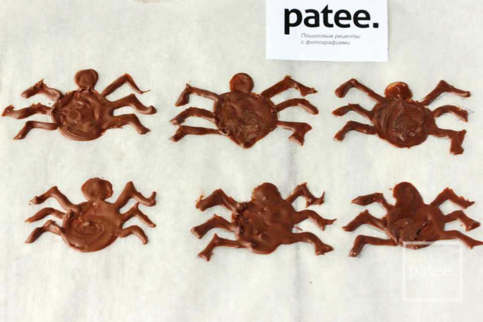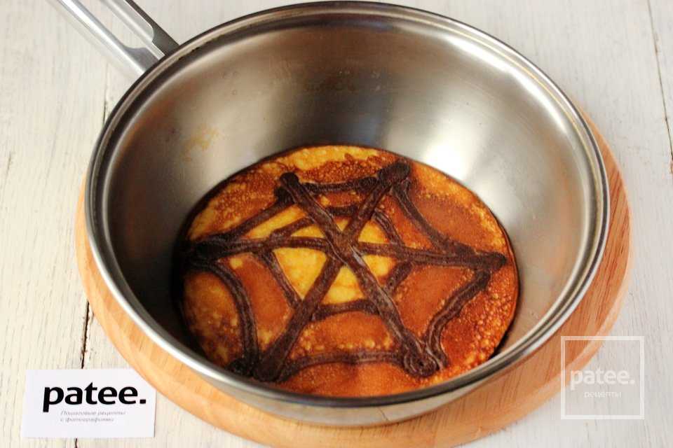 Параллельно с жаркой блинов нам необходимо сделать шоколадных паучков. Для этого на листе пергамента для выпечки рисуем их силуэт, переворачиваем лист и растопленным чёрным или молочным шоколадом с помощью зубочистки рисуем по наброскам тельца паучков. Сразу же перекладываем их в холодильник для застывания шоколада. Паучков можно делать так много, сколько вам угодно; их размер и форма могут быть разными; также растопленным белым шоколадом можно нарисовать на тельцах пауков рисунок, глаза, забавные рожицы.